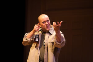 Douglas Taurel reflects on “The American Soldier” in his one-man play, which concluded a run at the JPAS Westwego Theater of the Performing Arts (Photo via Douglas Taurel)