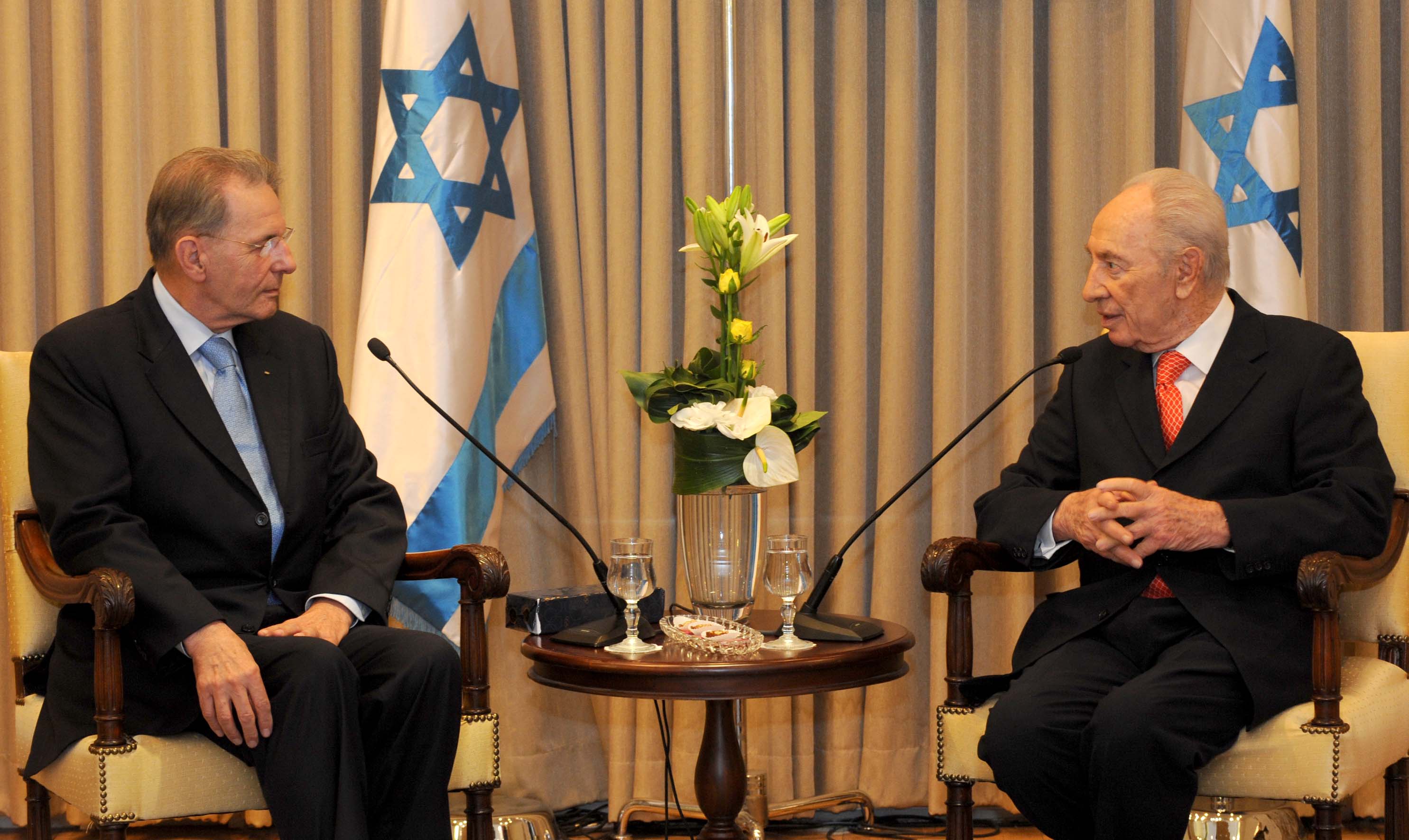 IOC President Jacques Rogge, left, shown meeting with Israeli President Shimon Peres in October 2010, told the audience at a memorial for the Israelis slain at the Munich Olympics in 1972 that the attack “was a direct assault on the core values of the Olympic movement.” (Mark Neyman/GPO/FLASH90/JTA)