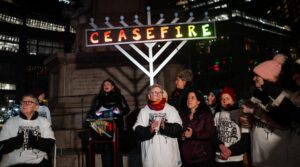 The activists then raised a 9-foot tall menorah emblazoned with the word “ceasefire” in multi-colored lights, each letter adorning one of the nine candle stems, ushering in the Hanukkah holiday with pleas for a halt to the Israel-Hamas war.