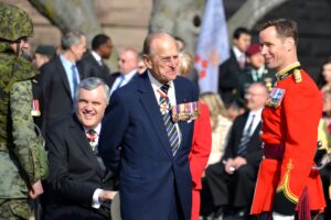 Prince Philip, center, enjoys a lighthearted moment with the Commanding Officer of the 3rd Battalion of the Royal Canadian Regiment in Toronto, Canada on 27 April, 2013. (Jamie McCaffrey)