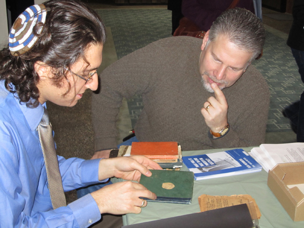 Dr. Devin Naar, left, and community member Rick LaMarche, examining Ladino documents at the Purim Bazaar at Congregation Ezra Bessaroth in Seattle, Wash., March 2012. (Andrea Soroko)