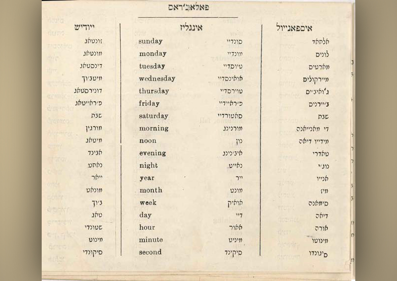 A document from "A Guide For Sephardic Immigrants in America," which was published in New York in 1916, showing words in English and their translation in Yiddish and Ladino. (Courtesy of Isaac Azose)